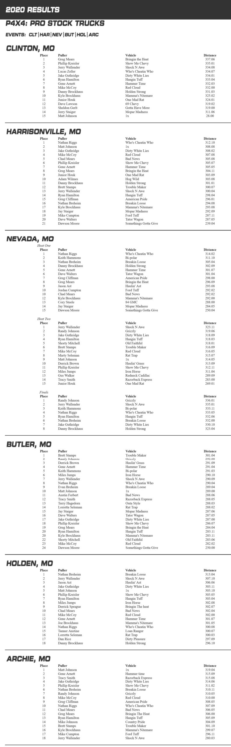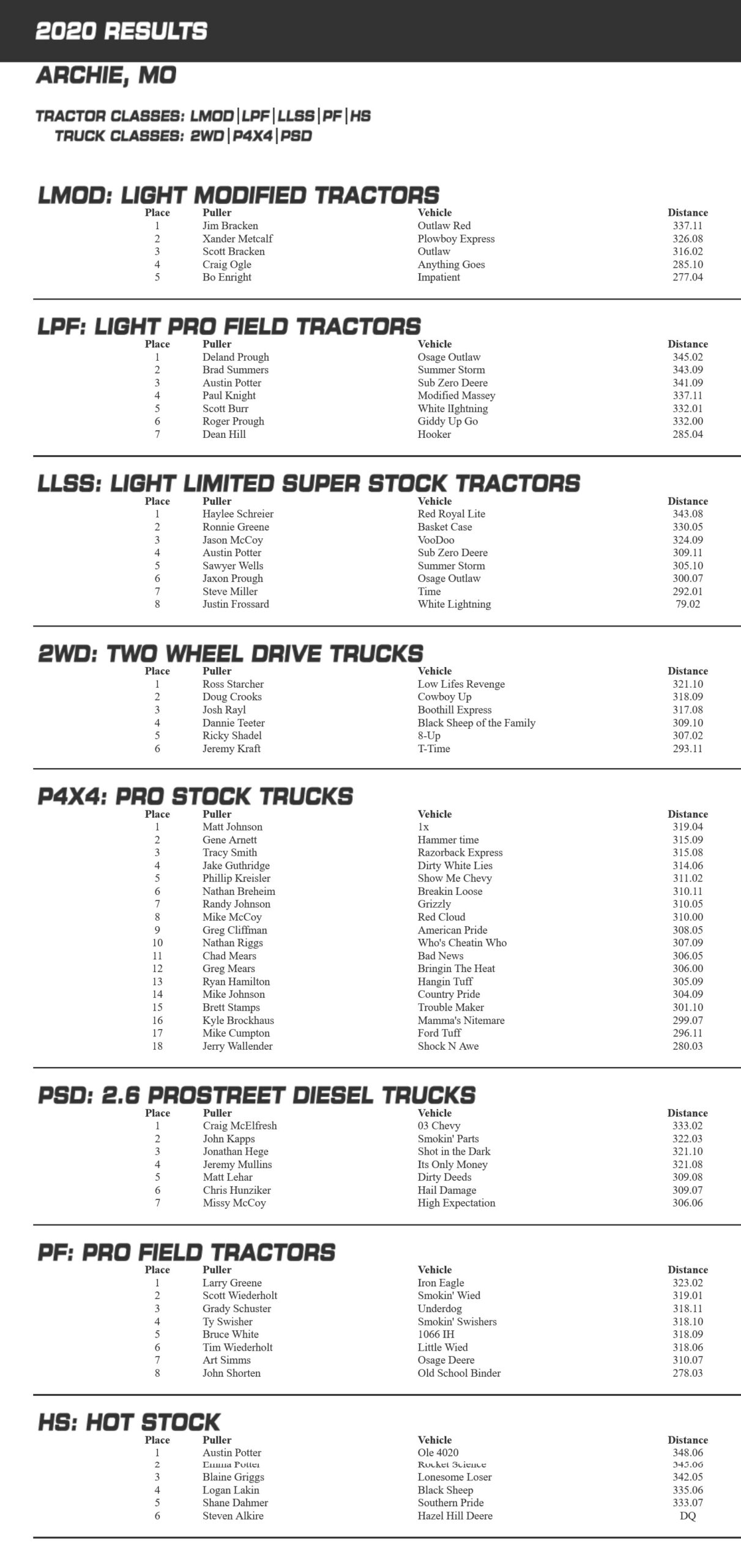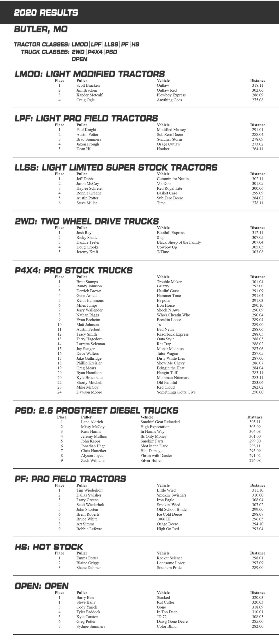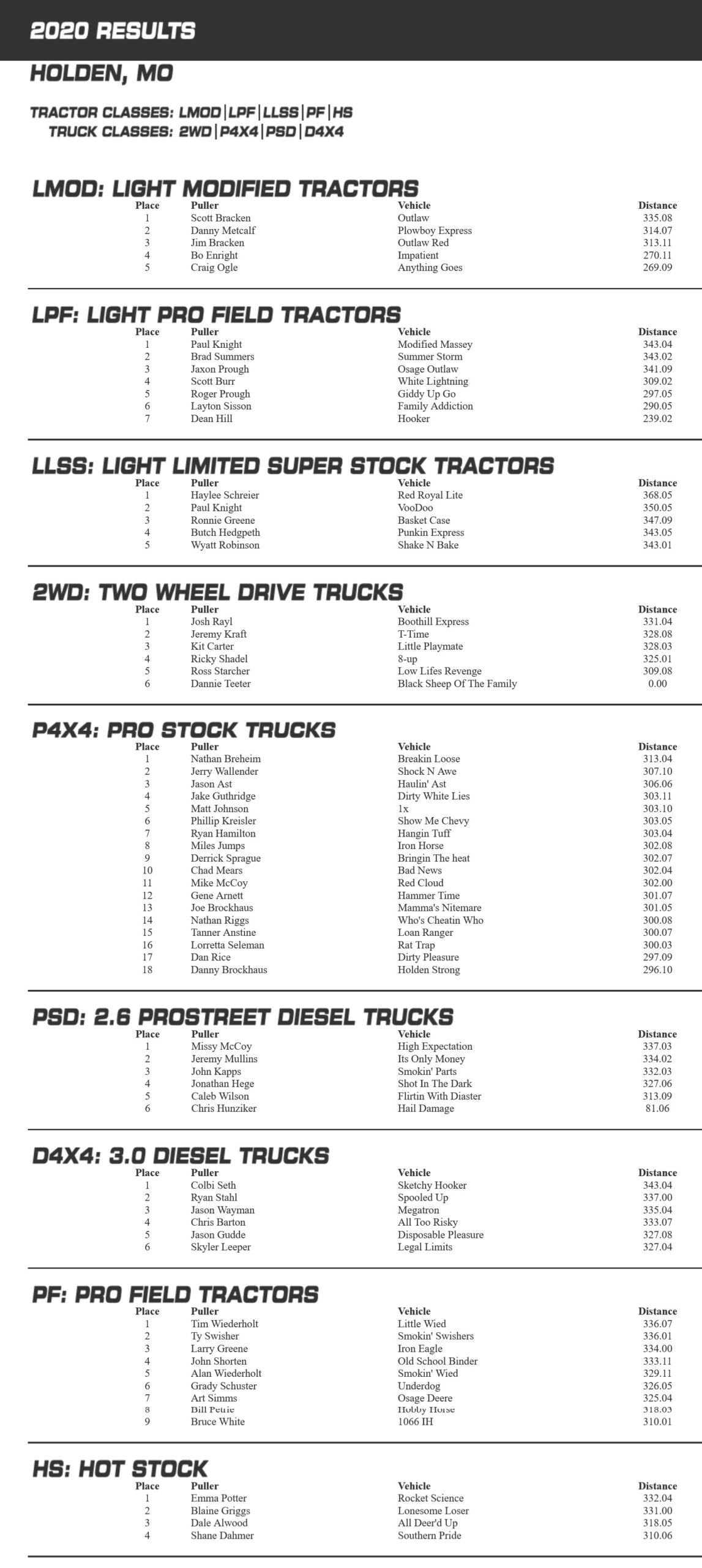 2020 Results By Event Clinton - 7-11-20 Falls City - 8-7-20 Harrisonville - 8-22-20 Nevada - 9-12-20 Butler - 9-13-20 Holden - 9-19-20 Archie - 10-3-20 BY CLASS (TRACTOR) LM LPF LLS PF LPS HS BY CLASS (TRUCK) 2 Wheel Drive ProStock 3.0 Diesel 2.6 Prostreet Diesel Open