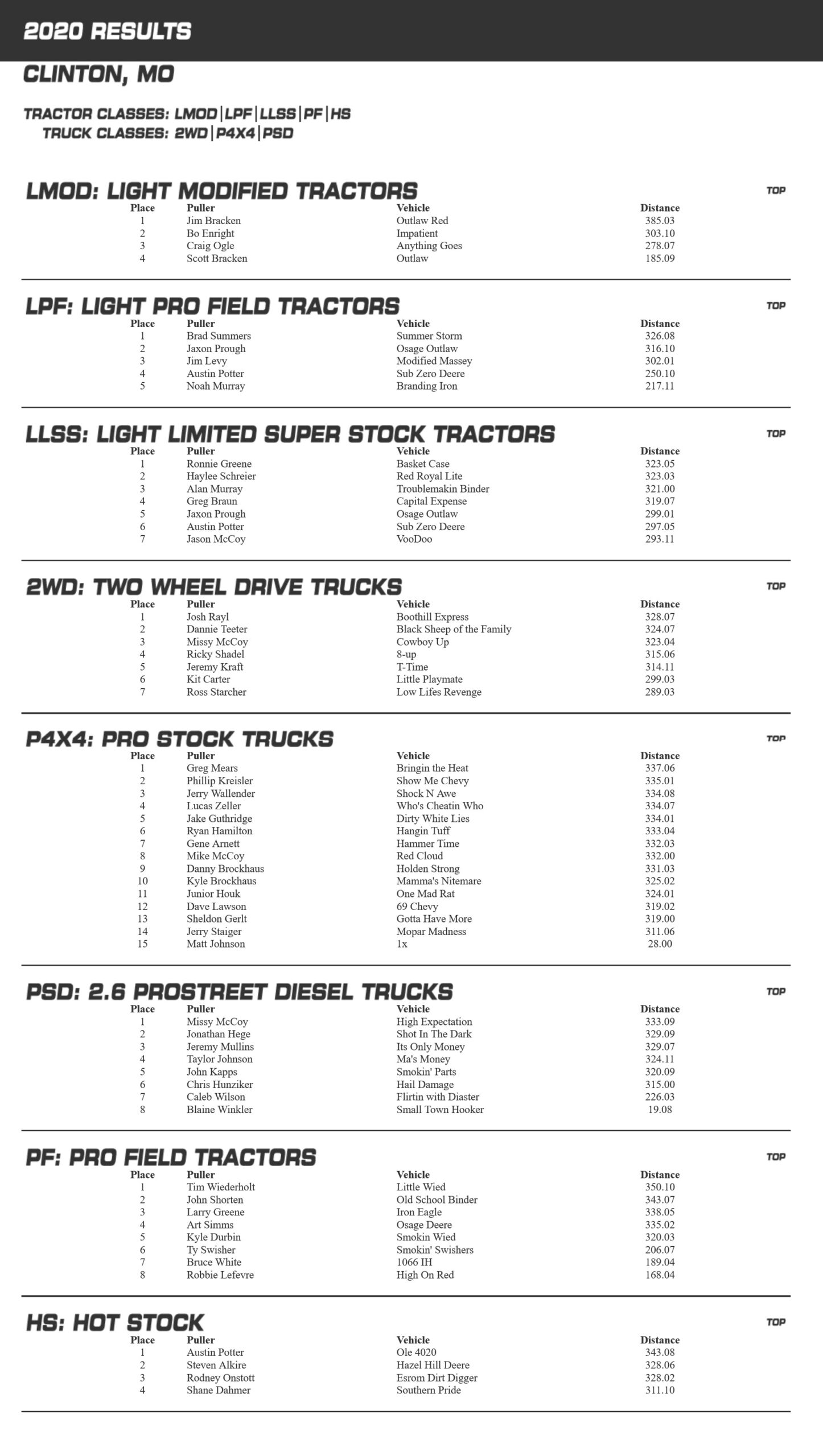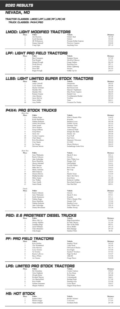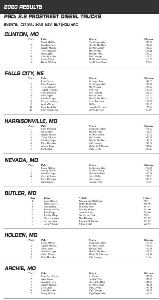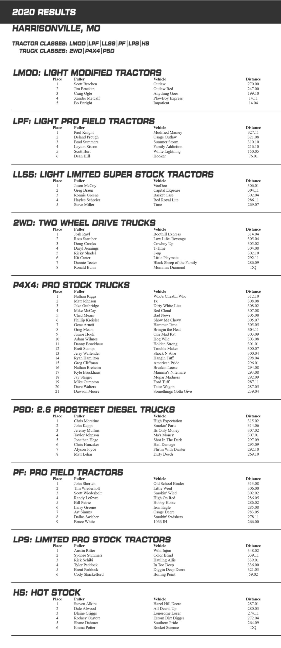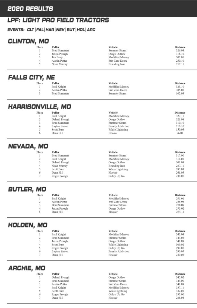 2020 Results By Event Clinton - 7-11-20 Falls City - 8-7-20 Harrisonville - 8-22-20 Nevada - 9-12-20 Butler - 9-13-20 Holden - 9-19-20 Archie - 10-3-20 BY CLASS (TRACTOR) LM LPF LLS PF LPS HS BY CLASS (TRUCK) 2 Wheel Drive ProStock 3.0 Diesel 2.6 Prostreet Diesel Open