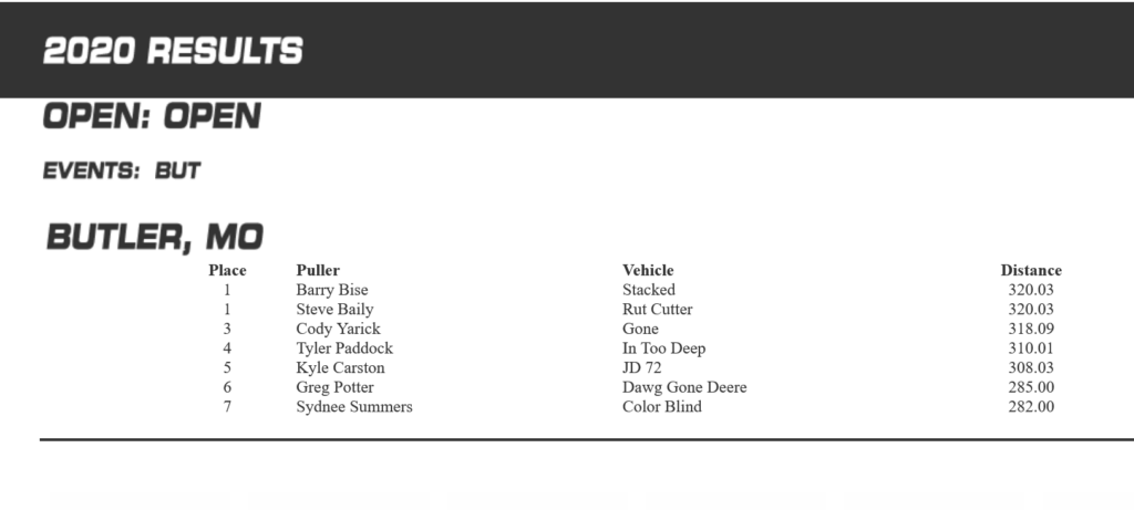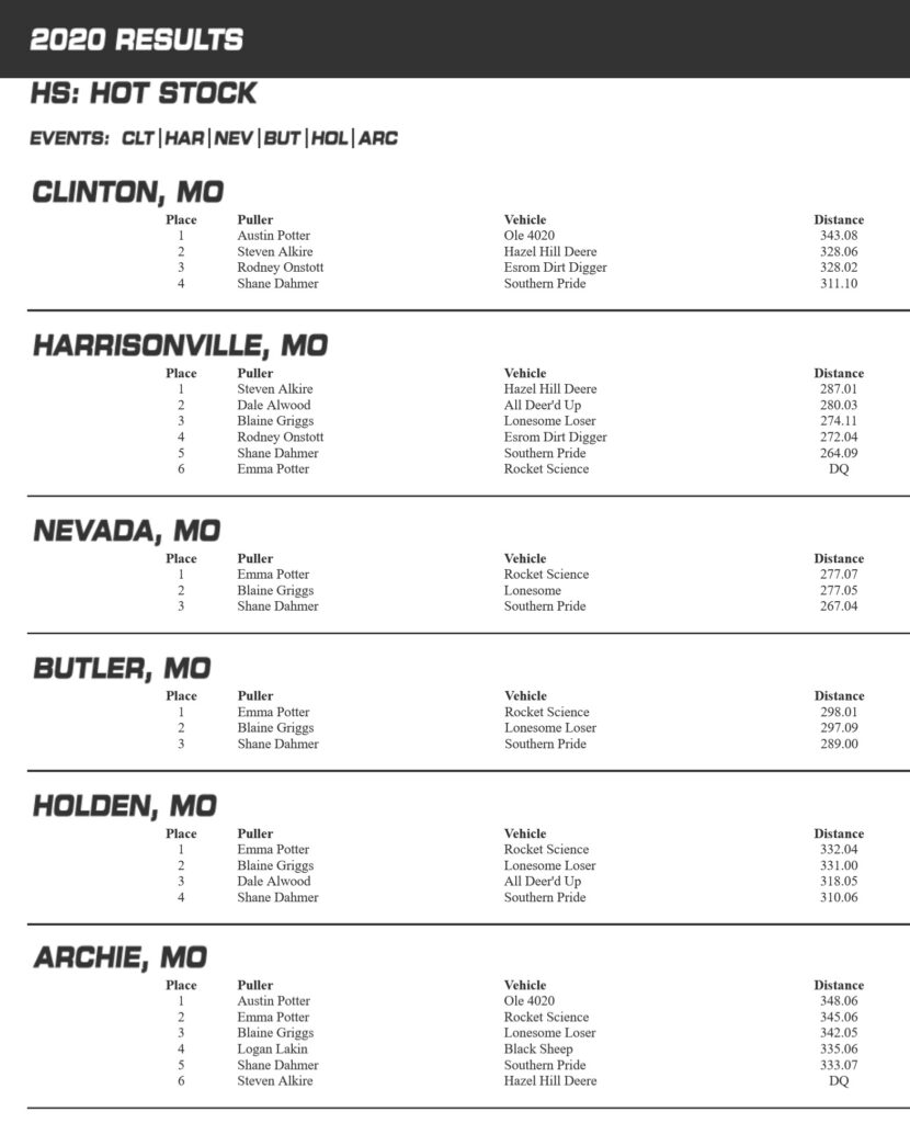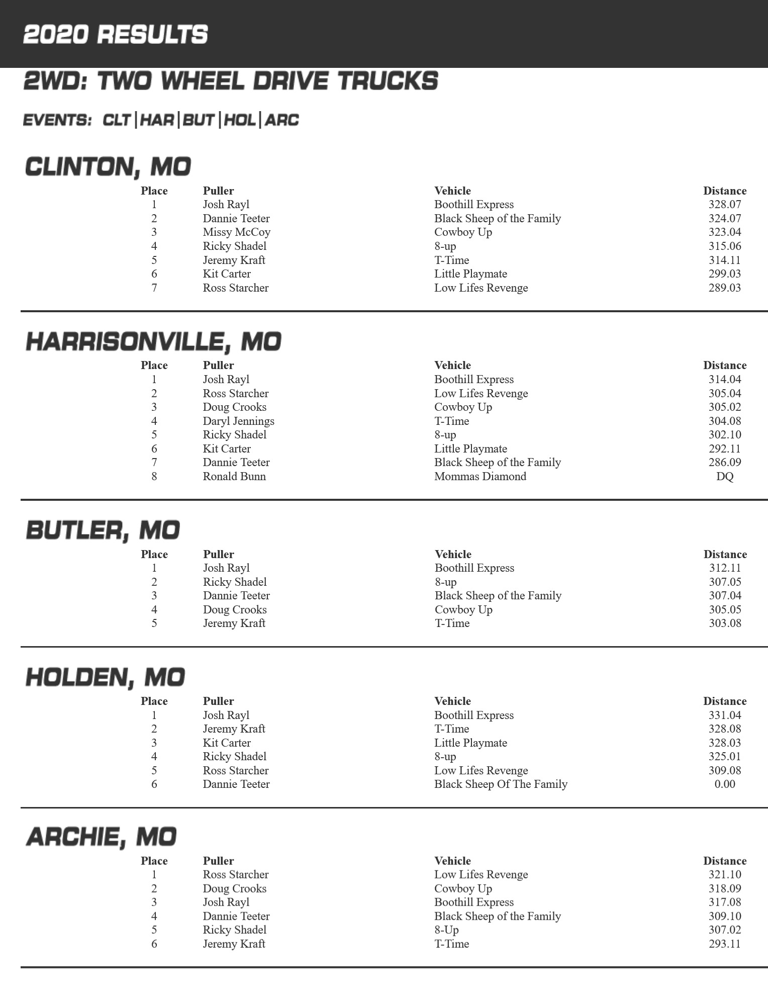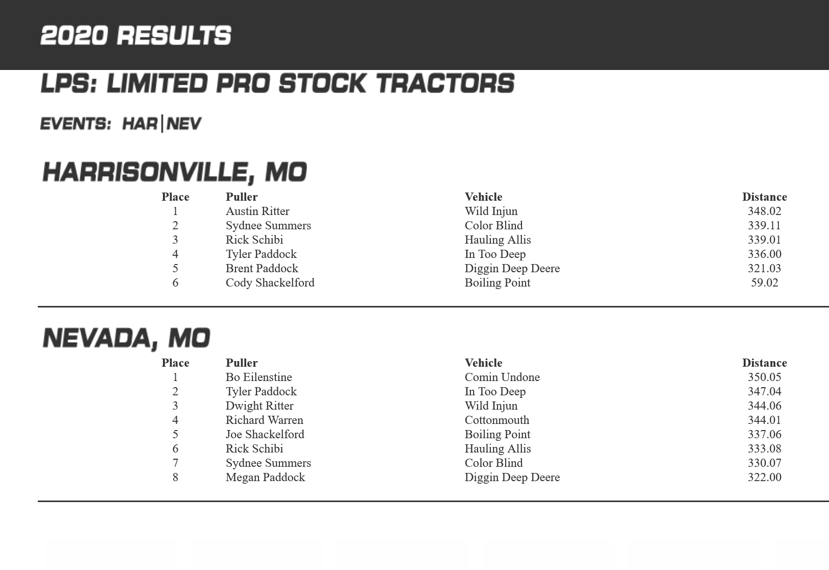 2020 Results By Event Clinton - 7-11-20 Falls City - 8-7-20 Harrisonville - 8-22-20 Nevada - 9-12-20 Butler - 9-13-20 Holden - 9-19-20 Archie - 10-3-20 BY CLASS (TRACTOR) LM LPF LLS PF LPS HS BY CLASS (TRUCK) 2 Wheel Drive ProStock 3.0 Diesel 2.6 Prostreet Diesel Open